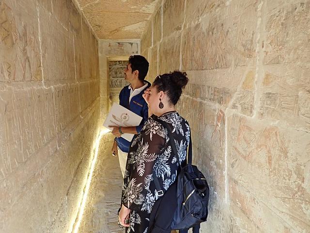 Wael geeft enige uitleg aan Singalita over de afbeeldingen op de muur van deze prachtige mastaba.